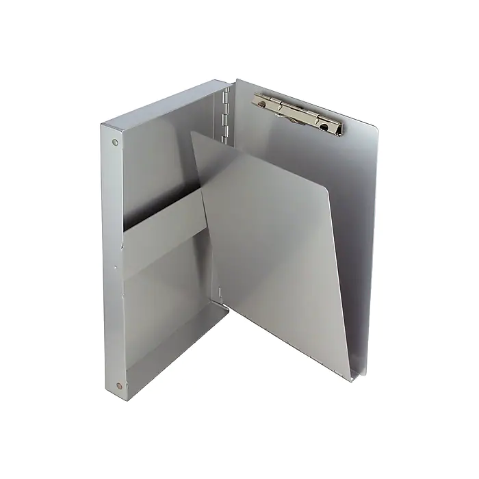 Take notes or fill out paperwork while in the field or away from your desk with this form folder. The hinged writing plate protects carbonless documents from write-through, and the storage compartment boasts a movable strap to keep pages from shifting. A low-profile metal clip holds papers in place while you write for neat, accurate results. This Saunders open-side form holder features sturdy aluminum construction for enduring quality.