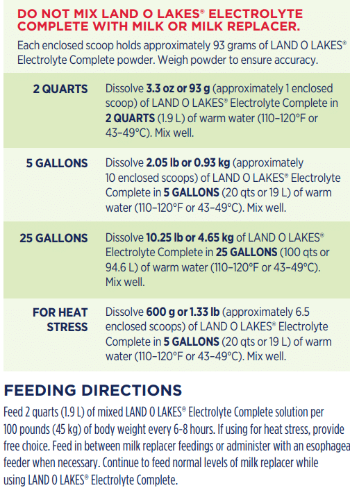 Feed 2 quarts (1.9 L) of mixed LAND O LAKES® Electrolyte Complete solution per