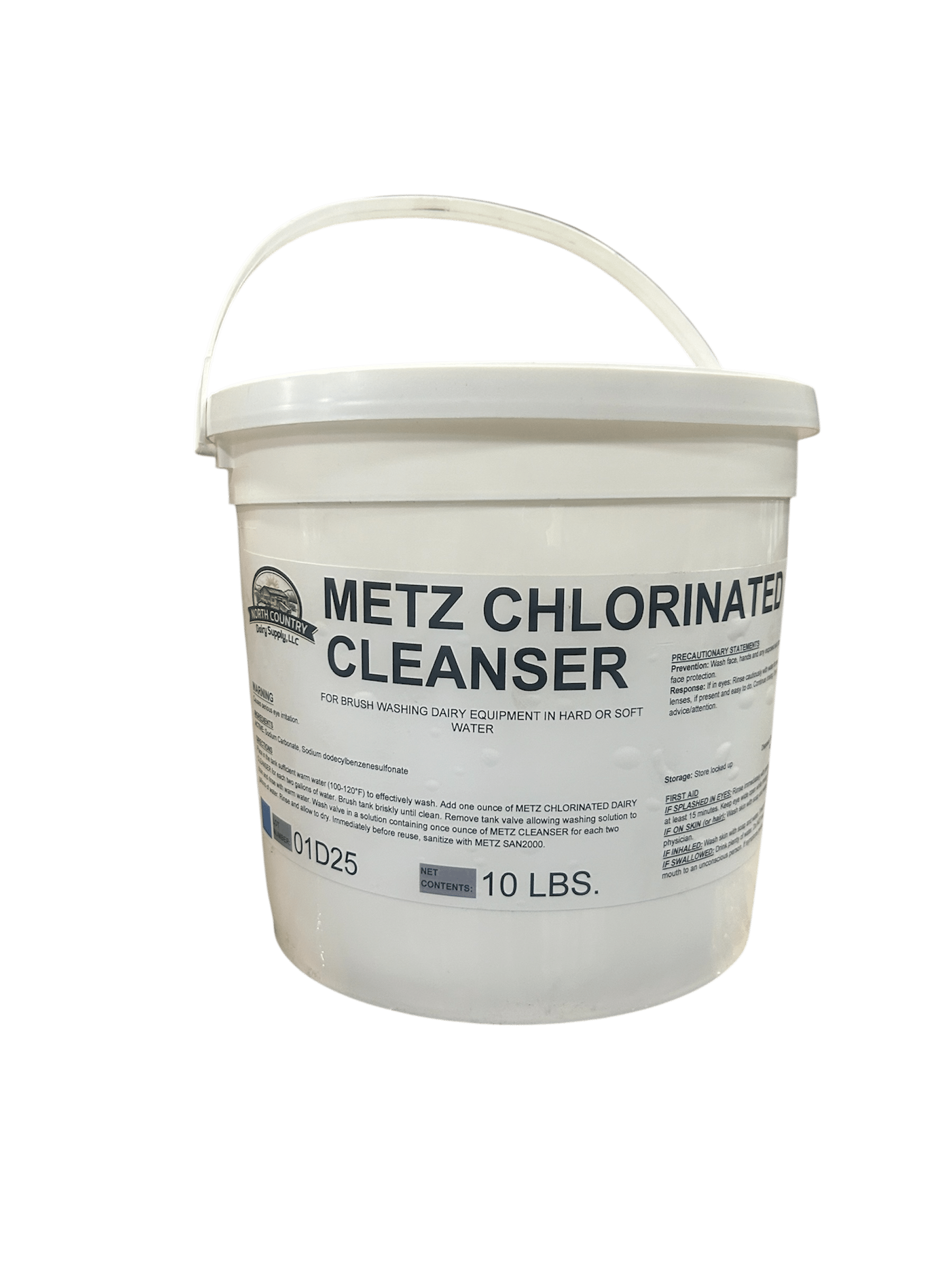- Wash with 1oz of METZ Chlorinated Dairy Cleanser per 2 – 3 Gallons of Warm 100 – 120° Water, Thoroughly Scrub all surfaces .